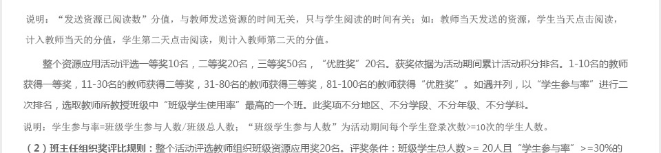 | 发送资源阅读数 | 任教班级的学生每点击一个“教师发送的资源”给1分 | 教师每天最多能发送3次资源,任教班级的学生每点击一个“教师发送的资源”加1分,重复点击不重复计分,每位教师每天最多给80分 |