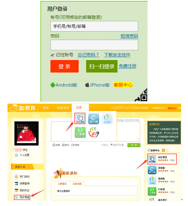 http://www.ydxxt.com/ ,输入帐号、密码,点击登录,进入和教育平台后,点击“同步课堂”进入。