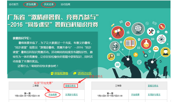 在活动页面上方点击“参加竞赛”。每一个年级对应一个“查看总排名”,在这里可以看到自己的成绩及排名。