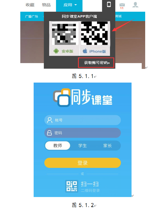 珠海家长用户通过互联网登录“广东省基础教育网”或“和教育”进入到“同步课堂”个人首页,用手机扫描二维码下载“同步课堂”客户端,然后通过二维码下方的“获取账号密码”取得客户端账号密码输入(如下图5.1.1),选择用户类型,点击“登录”即进入到“同步课堂”客户端应用页面(如下图5.1.2)。