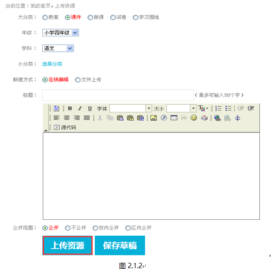 点击首页右上角红框的“上传资源”按钮(如图2.1.1),进入上传资源页面。在页面中选择资源的分类、年级、学科、版本、小分类,填写标题,选择“文件上传”,点击“上传资源”(如图2.1.2),即完成资源上传。