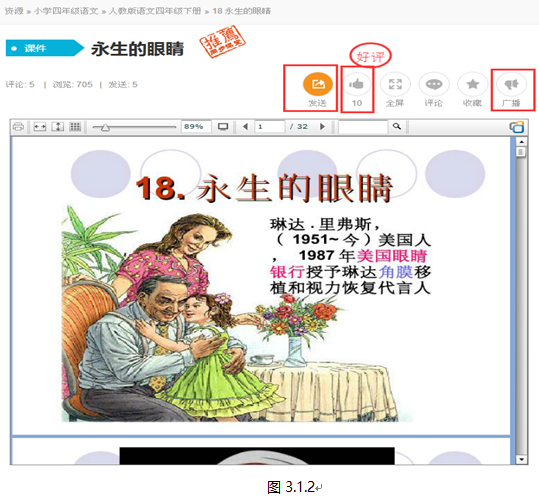 教师上传资源后,在“我的资源”里可以看到自己上传的资源(如图3.1.1)。点击“发送”按钮,将资源发送给学生、家长(如图3.1.1)。学生、家长收到资源后,按照教师的要求进行学习和辅导,并对教师发送的资源进行好评(如图3.1.2)。教师要想更多用户对自己制作的资源发表意见,可通过“广播”将自己制作的资源发布出去等(如图3.1.2)。