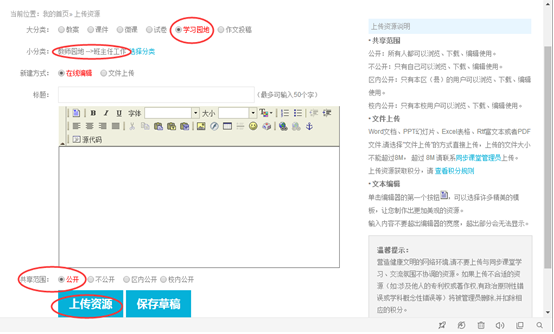 说明:在页面中选择资源大分类时选择学习园地在小分类中选择“教师园地”中的“班主任工作”。可以选择“在线编辑”和“文件上传”两种形式上传资源。公开范围选择“公开”教师资源只有选择公开才可以参赛。点击“上传资源”就完成了资源的上传。如图所示: