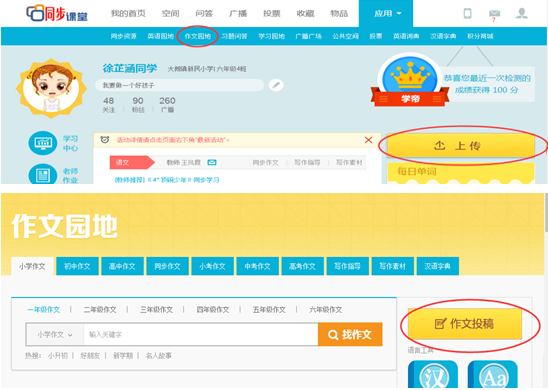 学生点击上方“作文投稿”上传作文,按提示编辑作文上传即可,如图: