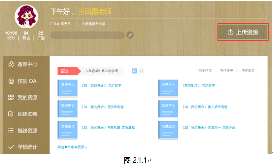 点击首页右上角红框的“上传资源”按钮(如图2.1.1),进入上传资源页面。在页面中选择资源的分类、年级、学科、版本、小分类,填写标题,选择“文件上传”,点击“上传资源”(如图2.1.2),即完成资源上传。