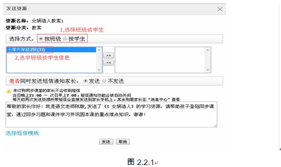 2) 教师向学生发送资源的同时,向家长发送辅导短信(详见下文“3、发送资源”)。教师向学生发送资源时,系统会根据教师发送资源的内容,给出匹配的辅导短信,教师可以将系统匹配的辅导短信直接发送给家长,也可以自行修改短信内容或重新编写短信内容发送给家长(如图2.2.1至2.2.2)。