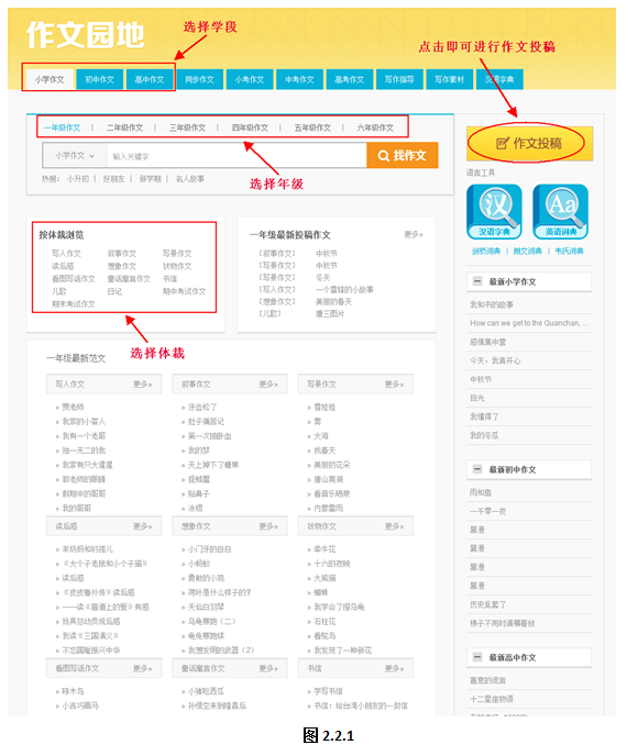 作文园地中,按学段、年级、体裁等提供了三万多篇优秀的范文、小考中考高考满分作文,并提供了丰富的写作指导及写作素材,供学生参考。如下图2.2.1