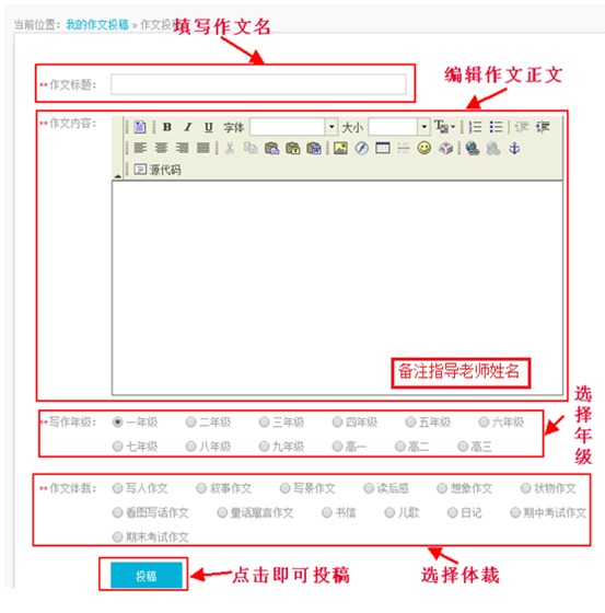 点击“作文园地”右上角的“作文投稿”,进入作文投稿页面,填写作文名、编辑作文正文(并在正文右下角备注指导老师姓名)、选择年级及作文体裁,点击“投稿”提交,即可参与竞赛活动。如图2.2.2