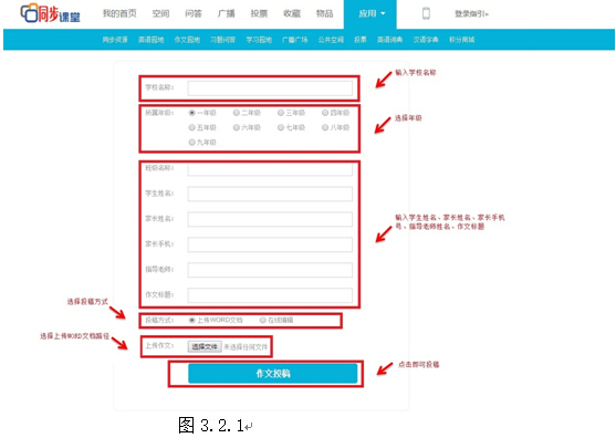 (二)、进入同步课堂作文投稿页面,填写学校名称、学生姓名、家长姓名、指导老师姓名、作文标题,选择年级及投稿方式,点击“作文投稿”提交,即可参与竞赛活动。