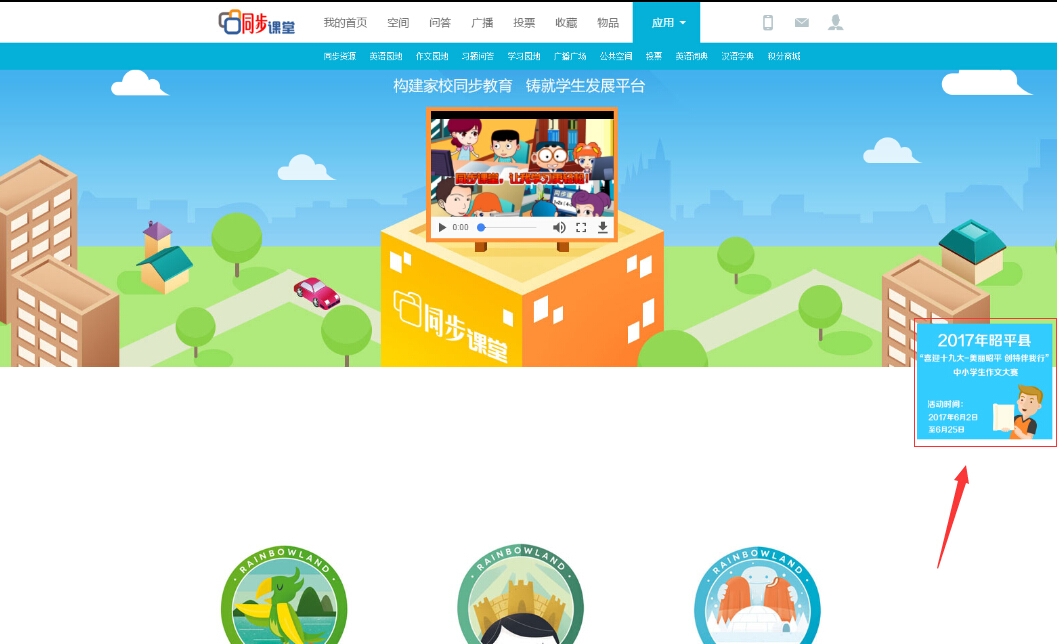 (二)、点击孩子姓名进入同步课堂学生界面首页,点击上方导航栏的应用“作文园地”即可链接进入作文园地页面。如图2.1.1