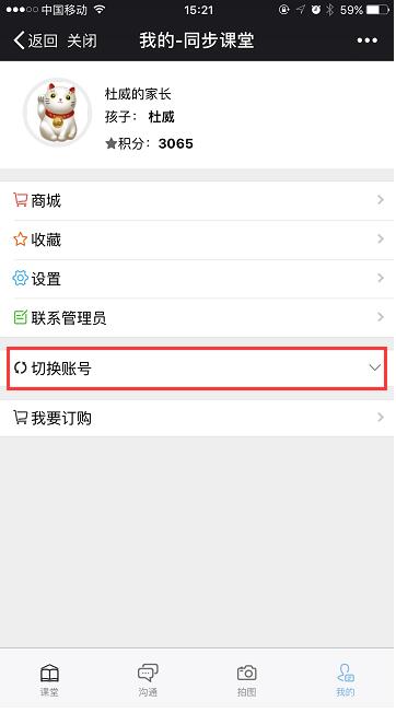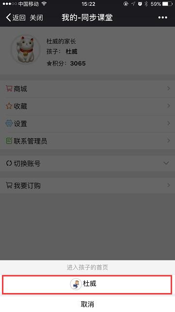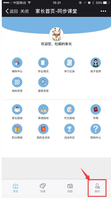3.进入“同步课堂”后,进入家长界面;点击右下角“我的”(如图2.3),进入界面后选择“切换账号”(如图2.4),点击孩子姓名(如图2.5),进入学生界面(注意:一定要进入学生页面参加竞赛的成绩才有效)。