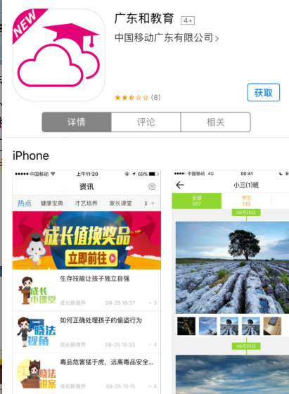 家长可以在手机上输入下载地址:http://gdhjy.cn,进入到手机客户端下载界面(如图5.1.1),以苹果系统手机为例,点击“立即下载”,进入到App Atore中的客户端下载页面,点击“获取”(如图5.1.2)进行安装。