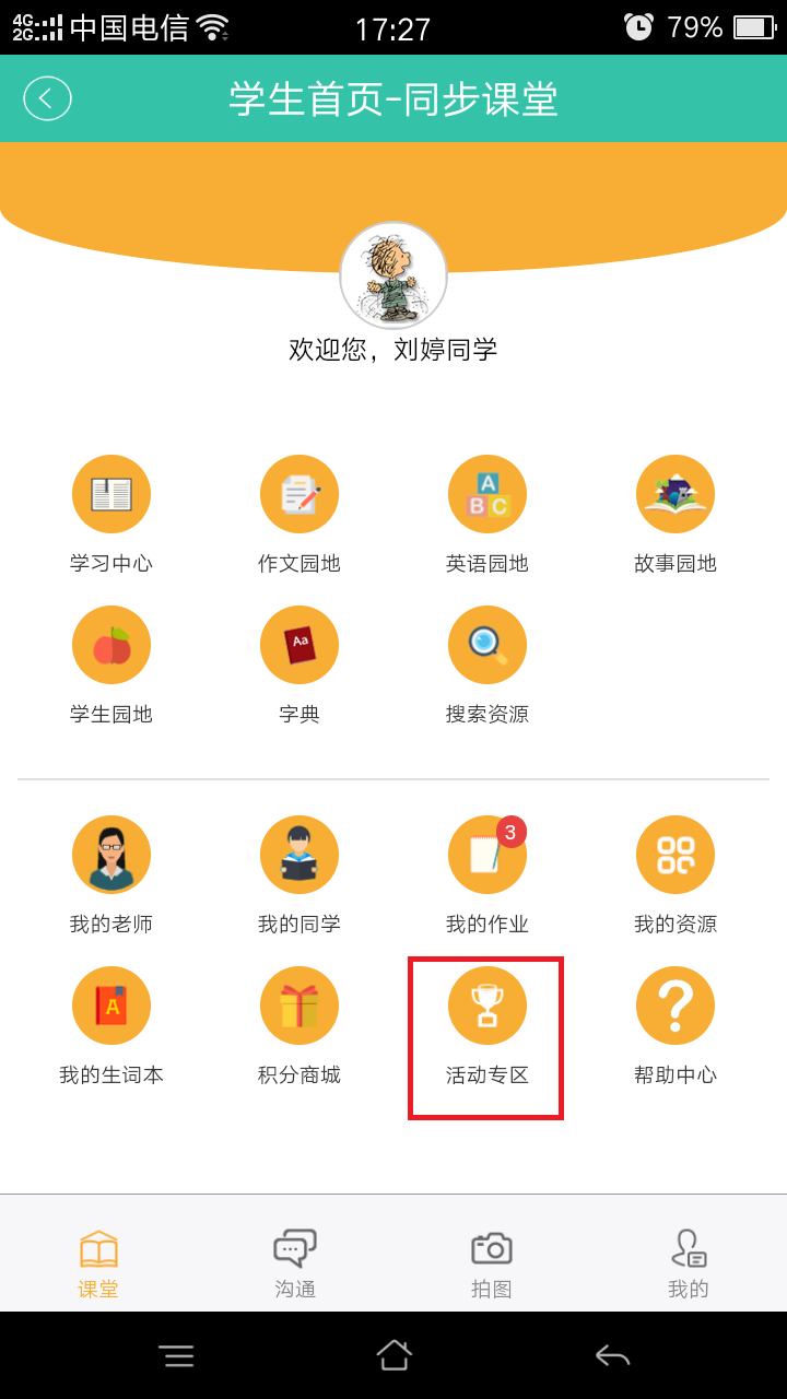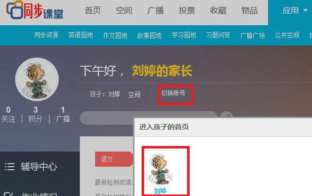 2.进入“同步课堂”家长页面后,点击“切换账号”,进入孩子的首页(如图十四)。(必须切换至学生界面参加竞赛所得成绩才有效。)