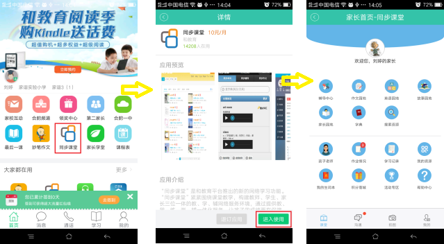 1.登录:输入和校园网址,www.anhuiwx.cn/,下拉菜单至“学习应用”,选择“精彩应用”中的“和教育”(如图十),进入和教育后,点击右上方“登录”,输入账号、密码、验证码进入(如图十一),然后点击右方“应用”(如图十二),选择“同步课堂”进入(如图十三)。