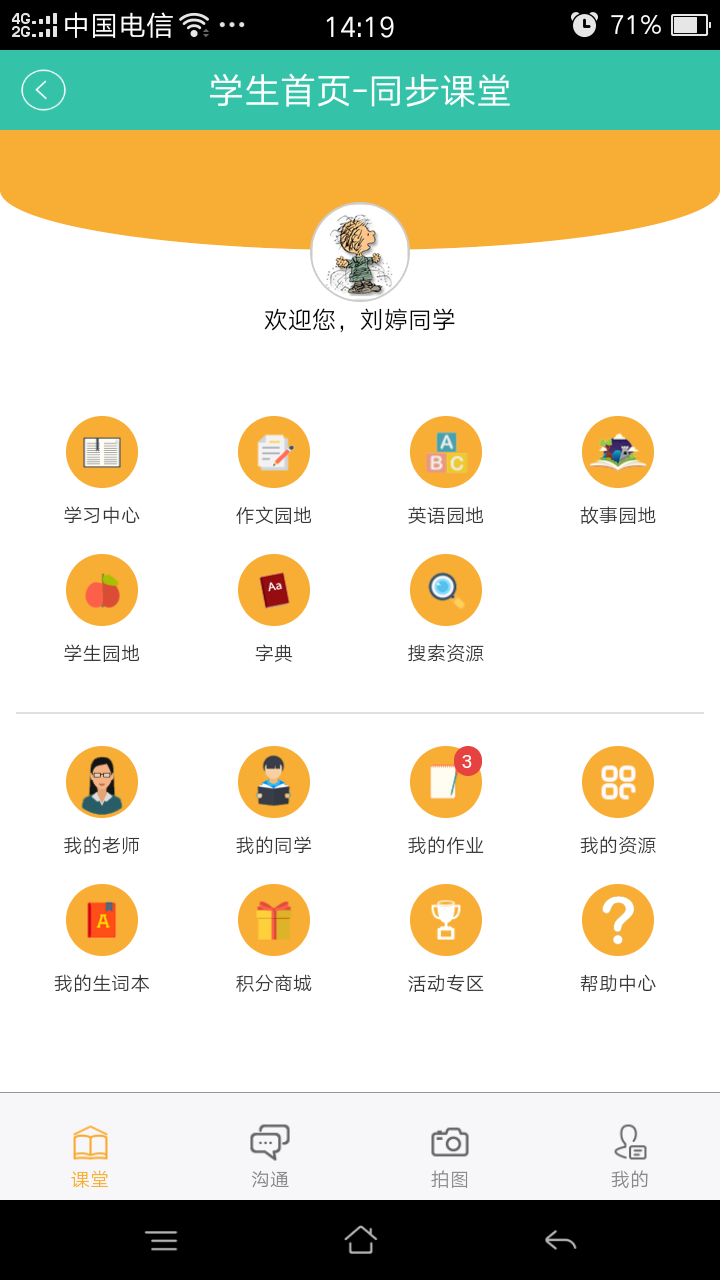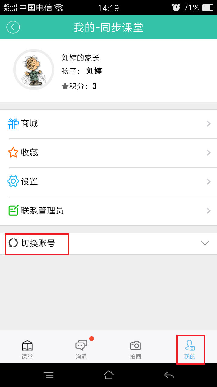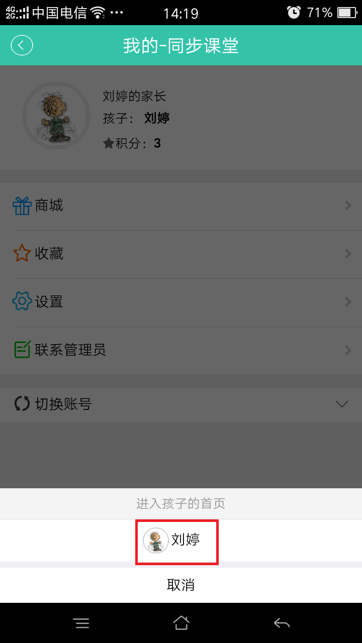 3.进入“同步课堂”后,点击右下角“我的”,进入界面后选择“切换账号”(如图六),点击孩子姓名(如图七),进入学生界面(如图八)
