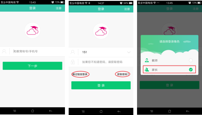 2.登录方式:打开“和教育”APP,根据提示,输入和教育账号或手机号(如图),点击“下一步”,输入密码,如忘记密码,可点击下方“通过短信登录”进行登录,或者点击“获取密码”,按提示步骤取回密码后进行登录。然后在“选择登录角色”中选择“家长”进入(如图2-2),最后在“首页”菜单中,找到“同步课堂”进入同步课堂页面(如图2-3)。进入“同步课堂”后,点击右下角“我的”,进入界面后选择“切换账号”,点击孩子姓名,进入学生界面(如图2-4)【注:以学生身份参加竞赛的成绩才有效!】