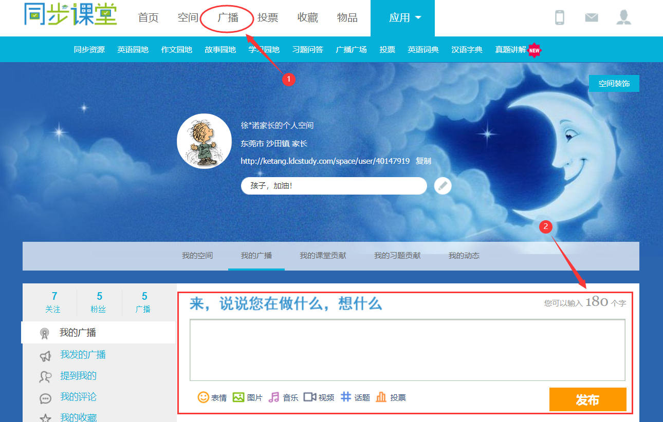 家长首页点击上方导航栏的“广播”,可发布广播获得积分,如图1.3.1。