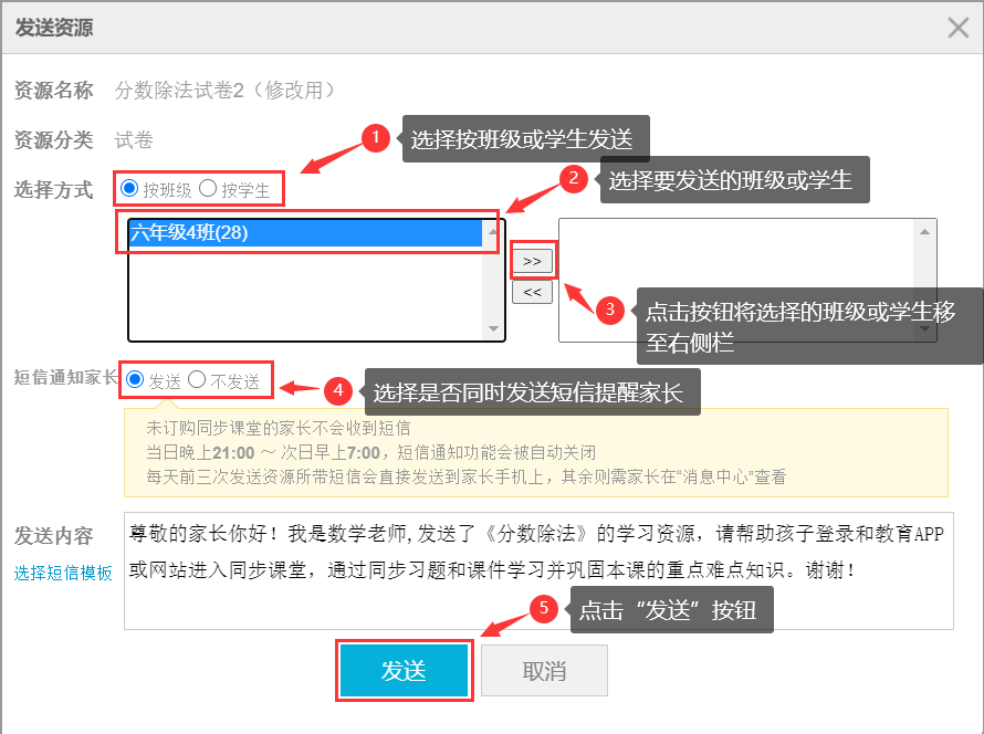 教师在给学生发送资源的同时,可以同时给家长发送辅导短信(详见下文“4、发送资源”)。教师向家长发送资源时,系统会根据教师发送资源的内容,给出匹配的辅导短信,教师可以将系统匹配的辅导短信直接发送给家长,也可以自行修改短信内容或重新编写短信内容发送给家长(如图2.3.1)。