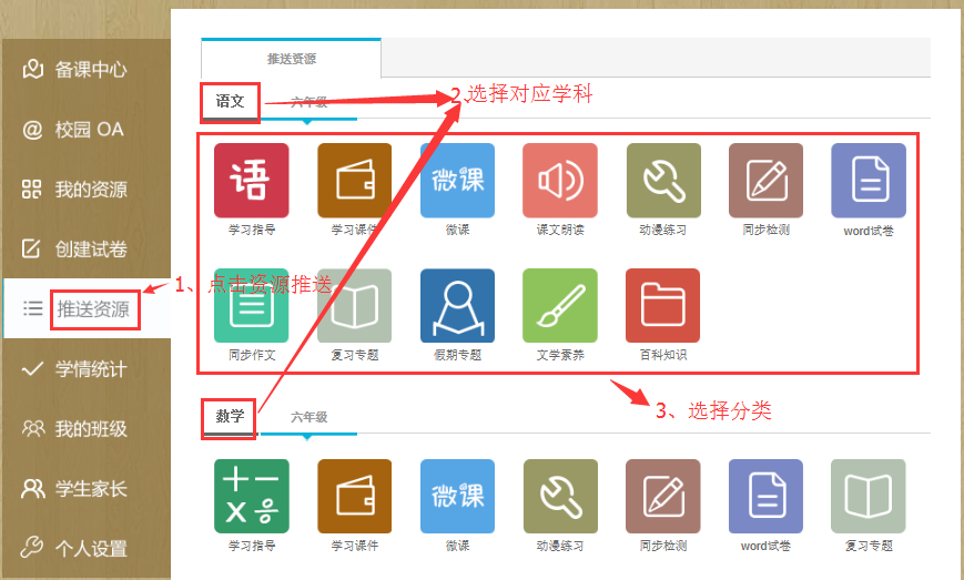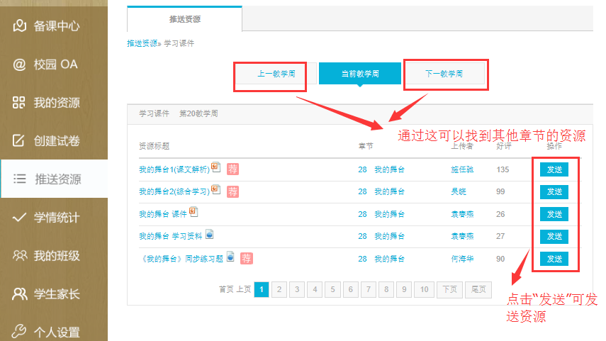 1)点击首页左边导航栏中的“推送资源”,选择好要发送的学科、分类进行发送(如图1.5.1至1.5.2)