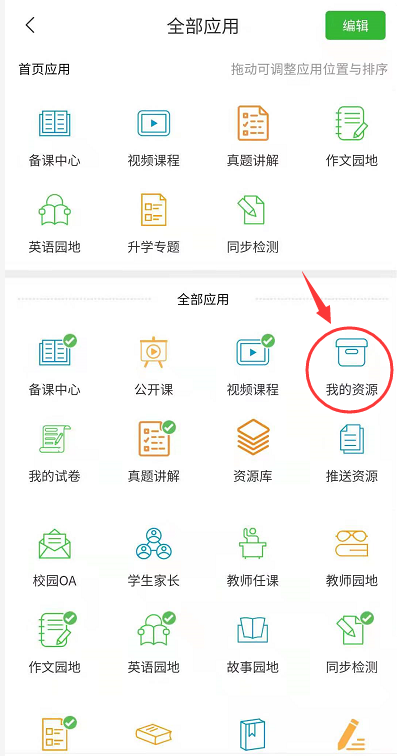 点击首页“所有应用”(如图2.2.1)→“备课中心”、“公开课”、“视频课程”、 “我的资源”、 “我的试卷”、“真题讲解”、“资源库”、“推送资源”、“作文园地”、“故事园地”等板块(如图2.4.1),进入后点击任意资源跳转至资源详情页(如图2.4.2), 点击“发送资源”按钮,按提示进行操作即可发送资源给家长。