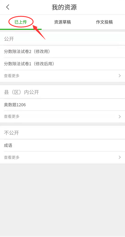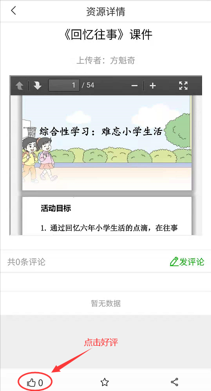 考虑到手机上传资源不方便,故目前手机端暂未提供上传资源功能,教师通过电脑端上传资源后,在手机端首页“所有应用”→“我的资源”→“已上传”可同步看到自己上传的资源(如图2.2.1、图2.2.2、图2.2.3)。点击任意资源进入资源详情页,点击“发送资源”按钮可将资源发送给学生(如图2.2.4)。学生收到资源后,按照教师的要求进行学习,并对教师发送的资源进行好评(如图2.2.5)。