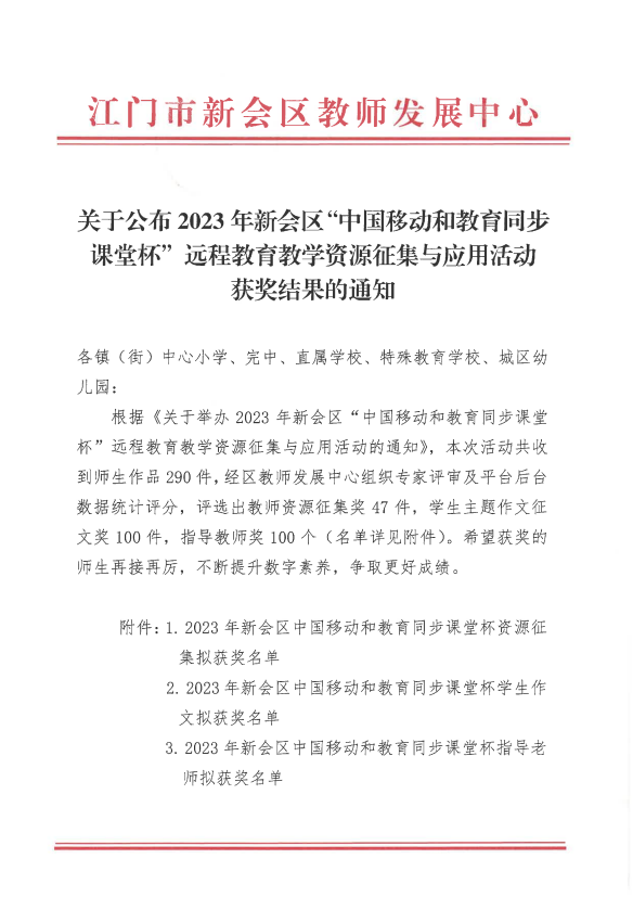 2023年新会区“中国移动和教育同步课堂杯”学生主题作文获奖名单